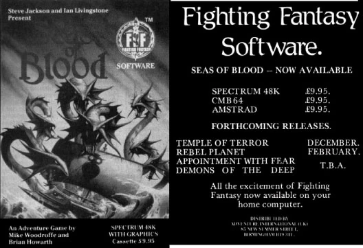 The first book converted was SEAS OF BLOOD by Michael Woodroffe and Brian Howarth. This was marketed as "Fighting Fantasy Software" and officially distributed by Adventure International (UK).