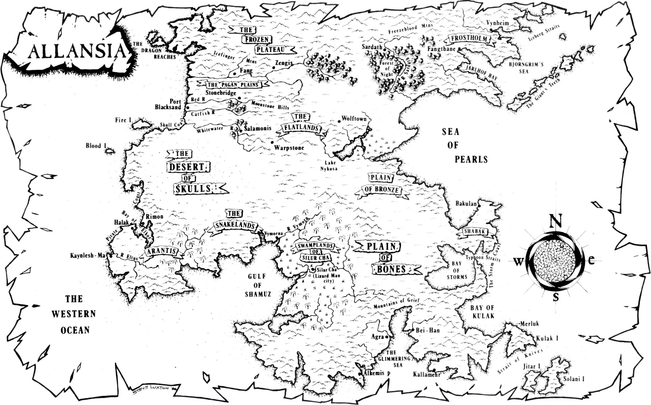 Inland the great plains of Bronze and Bones complete the vast flat sweep across the centre of the continent from the Teeming Plains in the north-west, down through the Flatlands and the Desert of Skulls and thence onto the Plains of Bronze and Bones. The Plain of Bronze is all but a baking desert. It is bounded by mountains to the west, the Sea of Pearls to the east, to the north it merges with the Flatlands around Lake Nykosa and then becomes the Plain of Bones to the south. The Plain of Bones is a huge desolate wind-swept land with little vegetation. However, it is cooler than the Plain of Bronze to the north. The aptly named Bay of Storms forms its eastern extent, whilst it's reach to the south is curtailed by the Mountains of Grief and to the west by the Swamplands of Silur Cha.[3]