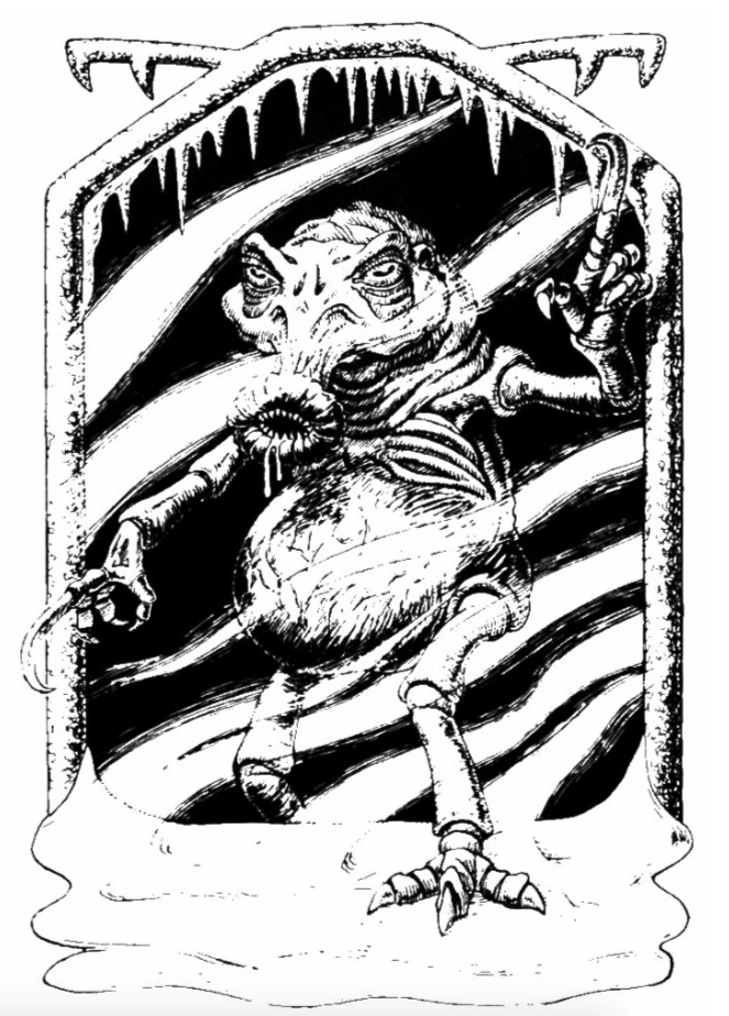 Coldclaws were green humanoids with spindly arms and legs and a wobbling belly, and a cruel sucker-like mouth with dozens of sharp teeth within.