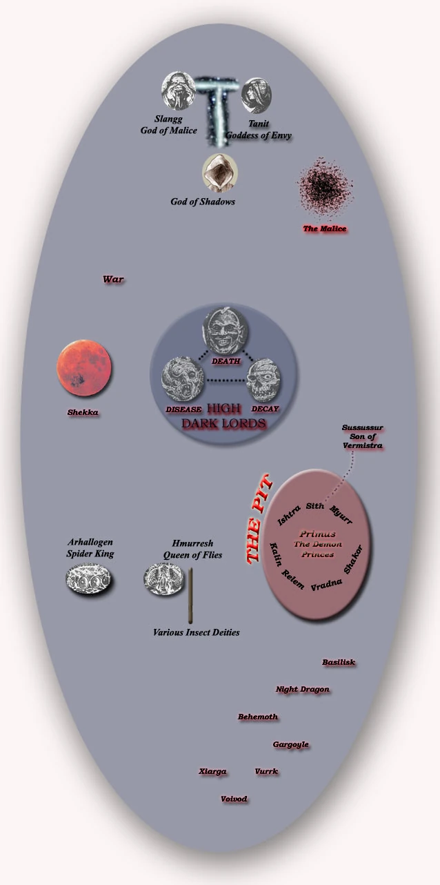 They are thought to be formless shadowy beings in their basic state, just manifestations of pure Evil. The exact number is not known. The most postulated was twenty-three Dark Lords; it is believed by some that these Dark Lords are all currently imprisoned in the Void.[2][3] The three chief Lords are known as Death and his two brothers Disease and Decay. Slangg and Tanit are sometimes referred to as such. Many scholars believe the spirit of War to be a further Dark Lord. Certainly Shekka, the ancient goddess of Witchcraft, is among their number and some believe The Malice is the diluted spirit of an unknown Dark Lord.