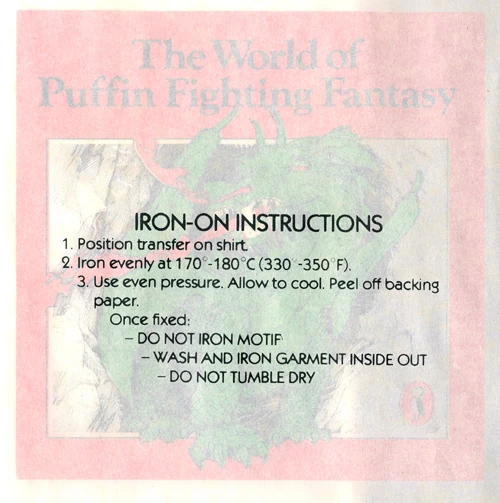 - Fighting Fantasy Transfer: This transfer depicted, in colour, a Dragon (in fact it was the dragon from The Warlock of Firetop Mountain). The transfer was an iron-on product designed to be ironed on to a shirt. Detailed instructions were contained on the reverse. Only by looking at the back of the transfer could you see what it said (unless you ironed it on of course). The title was "The World of Puffin Fighting Fantasy". There are not many other examples where the words Fighting Fantasy are preceded by "Puffin" in this manner. Perhaps this was an attempt to differentiate the Fighting Fantasy books from an increasing amount of other gamebooks that were beginning to hit the market from different publishers.
