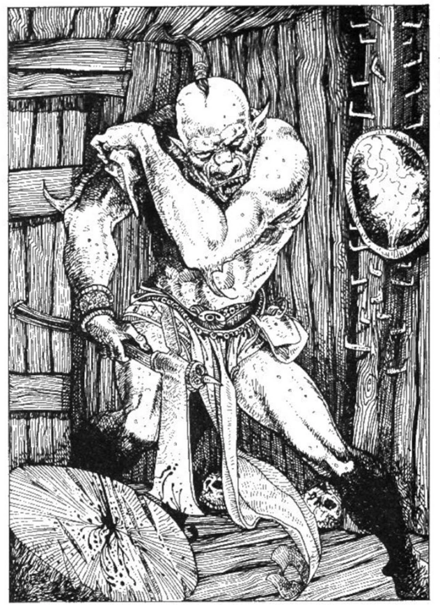 They resembled eight feet heigh muscular goblins, and their skin was thick and brown in colour.[1] In battle most garks fought aggressively and erratically with axes or oversized cleavers.[1]