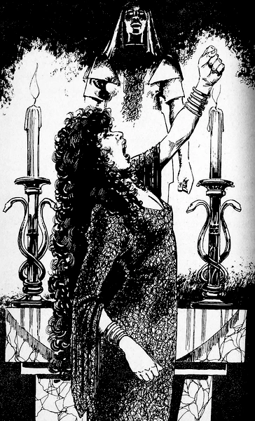 Hawkana is the tall, raven-haired High Priestess of the evil Warrior Goddess Fell-Kyrinla.[1] She covets the Talisman of Death, an Artefact of Doom that would extinguish all life and bring about the reign of the God Death (Orb).