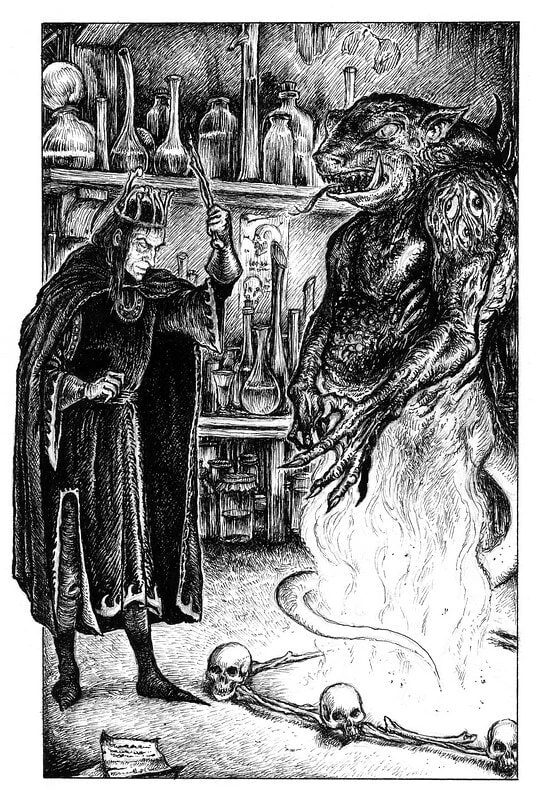 Magrand was a cadaverous-looking man in black robes and a crown of bone. He lived in a mill in Colton-on-the-Marsh, guarded by hordes of zombies. Kremper the barkeep provided him with fresh victims to experiment on.[2]