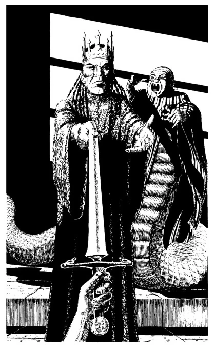 The magical blade had warned him of the treacherous official, who had, only seconds before losing his head, resumed his true form - that of a gigantic Serpent with the arms and head of a Human, but venomous fangs instead of teeth. Maior now understood that Merzei had been telling the truth.