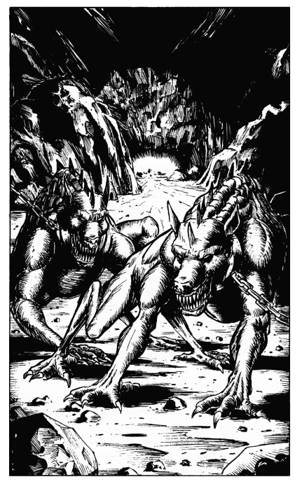 When used as guardians they were typically chained in pairs to their some narrow passageway.