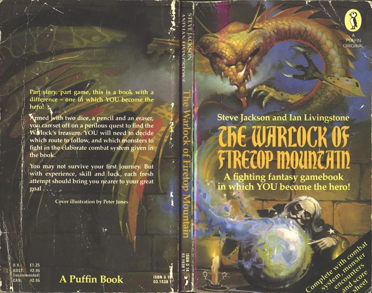 Initially, as the first book in the series, The Warlock of Firetop Mountain had been viewed by Puffin Books as a something of a one off (hence the small print run) and thus became the only book of the range to feature a warp-around cover (by Peter Andrew Jones). Subsequent books would have a front cover illustration only.