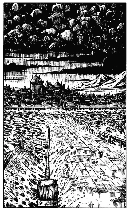 Sardath was involved in a disaster not too long ago, when Dark Elves, somehow magically changed into Black Flyers, came to Sardath and destroyed the bridge connecting the city with the mainland. They proceeded to lay siege to the city and the Dark Elf sorcerers aroused the elements around the city, which made relief impossible.