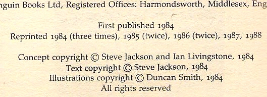 Prior to late 1988/early 1989, in the Fighting Fantasy books this was set out as seen to the right. In this style of information each year of printing is given, with the number of print runs that year indicated in brackets "( )". In this example, the book has been printed a total of 10 times. The printing impression is thus noted as "10" and in the notes section the following is added: "*Print History: 1984 (1st); 1984 (3x); 1985 (2x); 1986 (2x); 1987; 1988"
