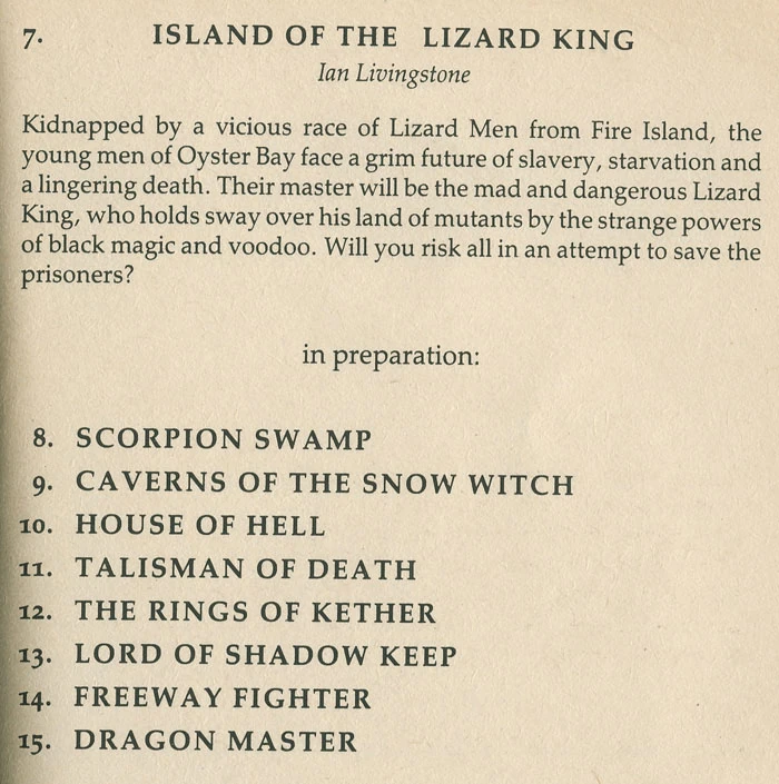 In the back of the first edition of Sorcery! Book 3 (The Seven Serpents) there was an advert for forthcoming Fighting Fantasy gamebooks. Two of the listed titles aren't to be seen on any list of Fighting Fantasy gamebooks, although the first (by Oliver Johnson) was published as part of a different range of gamebooks and the second is believed to be a working title for a published Fighting Fantasy gamebook by Ian Livingstone.