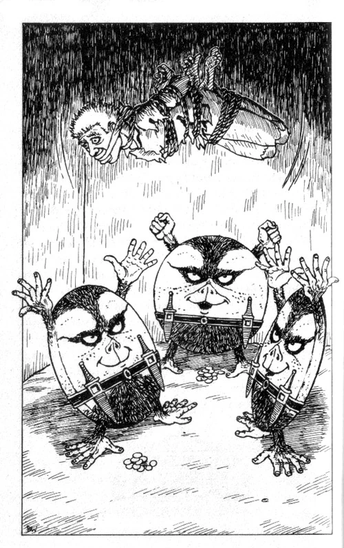 “ The footsteps that you heard - which really ought to be called 'handsteps' - belong to three WHEELIES which now roll down the passageway towards you, forcing you back to the door. These creatures are peculiar beasts, having, instead of legs, an extra set of hands. They move by cartwheeling along at quite a rapid pace. Their heads - or at least their faces - are set in the centre of their chests. Whilst they are not well-practiced at swordsmanship given their awkward means of movement, they are excellent knife-throwers. Grasping knives from their belts as they spin along, they can launch them at a rapid-fire pace, like large catherine wheels. At the moment, three such knives are speeding their way towards you...[2] ”